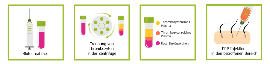 The highly concentrated blood plasma (without red blood cells) is particularly rich in thrombocytes, which in turn are enriched with highly concentrated growth factors. It is therefore also suitable for the treatment of hair loss: the PRP stimulates the hair root cells to regenerate and activate the blood vessel-forming cells. It contributes to better blood circulation in the hair root and increases the supply of nutrients to the scalp. Hair loss can be stopped and hair growth stimulated. Immediately after the blood plasma has been obtained, it is injected with a very fine needle into the skin area affected by hair loss. Since the procedure is injected just a few millimeters under the skin, it is almost painless. Flat and circular hair loss can also be successfully treated with PRP hair growth therapy.